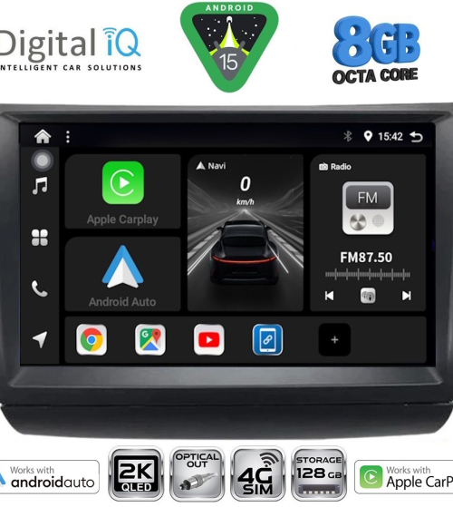 Το Apple CarPlay απαιτεί iPhone 5 ή νεότερο με την πιο πρόσφατη έκδοση του iOS.[/vc_column_text][/vc_column_inner][/vc_row_inner][/vc_column][vc_column width="1/2"][vc_row_inner][vc_column_inner width="1/4" padding_top="20px"][vc_single_image source="external_link" external_img_size="115x32" alignment="center" css_animation="zoomIn" custom_src="https://digitaliq.gr/wp-content/uploads/2024/10/Android_auto-Logo_certified_115.jpg"][/vc_column_inner][vc_column_inner width="3/4"][vc_custom_heading text="WIRELESS ANDROID AUTO" font_container="tag:h5|text_align:left" custom_heading_font_weight="600"][vc_custom_heading text="Licensed & Certified Android Auto" font_container="tag:h6|text_align:left" custom_heading_font_weight="500"][vc_column_text]Επεκτείνει την πλατφόρμα Android στο αυτοκίνητο με τρόπο που έχει σχεδιαστεί ειδικά για την οδήγηση και σας φέρνει αυτόματα χρήσιμες πληροφορίες και τις οργανώνει σε απλές κάρτες που εμφανίζονται ακριβώς όταν τις χρειάζονται. Έχει σχεδιαστεί για να ελαχιστοποιεί την απόσπαση της προσοχής, ώστε να μπορείτε να παραμένετε συγκεντρωμένοι στο δρόμο μπροστά σας.