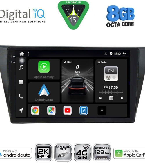 Το Apple CarPlay απαιτεί iPhone 5 ή νεότερο με την πιο πρόσφατη έκδοση του iOS.[/vc_column_text][/vc_column_inner][/vc_row_inner][/vc_column][vc_column width="1/2"][vc_row_inner][vc_column_inner width="1/4" padding_top="20px"][vc_single_image source="external_link" external_img_size="115x32" alignment="center" css_animation="zoomIn" custom_src="https://digitaliq.gr/wp-content/uploads/2024/10/Android_auto-Logo_certified_115.jpg"][/vc_column_inner][vc_column_inner width="3/4"][vc_custom_heading text="WIRELESS ANDROID AUTO" font_container="tag:h5|text_align:left" custom_heading_font_weight="600"][vc_custom_heading text="Licensed & Certified Android Auto" font_container="tag:h6|text_align:left" custom_heading_font_weight="500"][vc_column_text]Επεκτείνει την πλατφόρμα Android στο αυτοκίνητο με τρόπο που έχει σχεδιαστεί ειδικά για την οδήγηση και σας φέρνει αυτόματα χρήσιμες πληροφορίες και τις οργανώνει σε απλές κάρτες που εμφανίζονται ακριβώς όταν τις χρειάζονται. Έχει σχεδιαστεί για να ελαχιστοποιεί την απόσπαση της προσοχής, ώστε να μπορείτε να παραμένετε συγκεντρωμένοι στο δρόμο μπροστά σας.