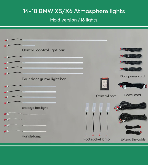 Standard 18pcs lamps (4 door handle lights, 4 door outline lights, 4 door storage box lights, 4 footwell lights, 2 central lights).
