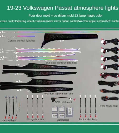 Full Ambient Light Kit 23 lighting options + 4 Door molds lights (4 door handle lights, 4 door contour lights, 4 door surface lights, 4 door storage box lights, 4 footwell lights, 1 on the left side of the steering wheel, 1 below the screen, and 1 front passenger dragon scale decorative panel)