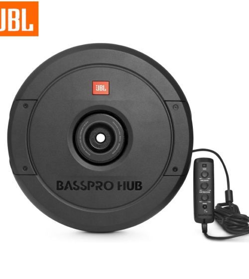 The new JBL Bass Pro Hub subwoofer delivers show & shine performance without crowding your passengers or sacrificing cargo area. This all-in-one powered subwoofer system fits into the hub of your spare tire for a super easy installation and out of sight sound solution. The built-in Class D amplifier delivers 200W RMS and is designed to work with the Bass Pro Hub subwoofer and enclosure as a system. The 11″ (279mm) feather-light fiberglass woofer cone with rubber surround delivers the signature kick and punch of JBL bass. And with over temperature protection (OTP) and over current protection (OCP) you can count on reliability at peak volume levels. The included remote control enables adjustment of crossover point, gain, phase—and a bass boost of 12dB when you’re in the mood and on the move. Whether you’re cruising or competing, the JBL Bass Pro leaves the competition behind without missing a beat.