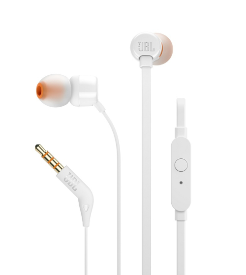 Introducing JBL T110 in-ear headphones. They’re lightweight, comfortable and compact. Under the durable earpiece housing, a pair of 9mm drivers punch out some serious bass, reproducing the JBL Pure Bass sound you’ve experienced in concert halls, arenas and recording studios around the world. In addition, the single-button remote on a tangle-free flat cable lets you control music playback, as well as answer calls on the fly with a builtin microphone. Making the JBL T110 your everyday companion for work, at home and on the road.